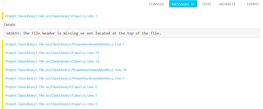 This example shows how to report issues as messages to an AppVeyor build using the AppVeyorBuilds alias: