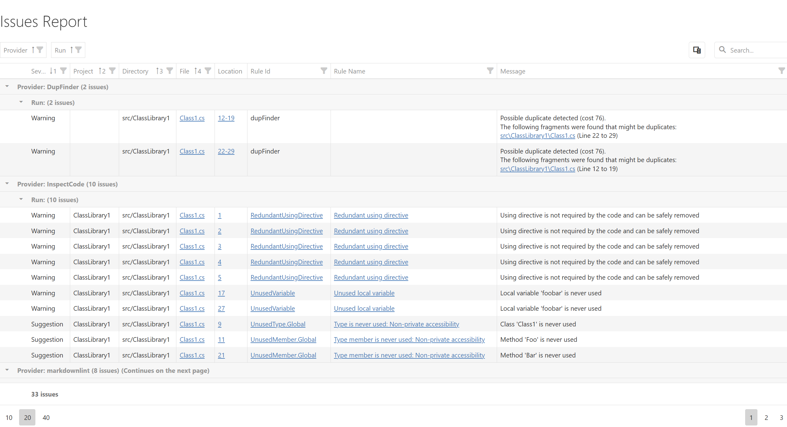 Provider,Run,Severity,Project,Directory,File,Location,Rule ID,Rule Name,Messageby default. - Support for grouping by multiple columns by user.