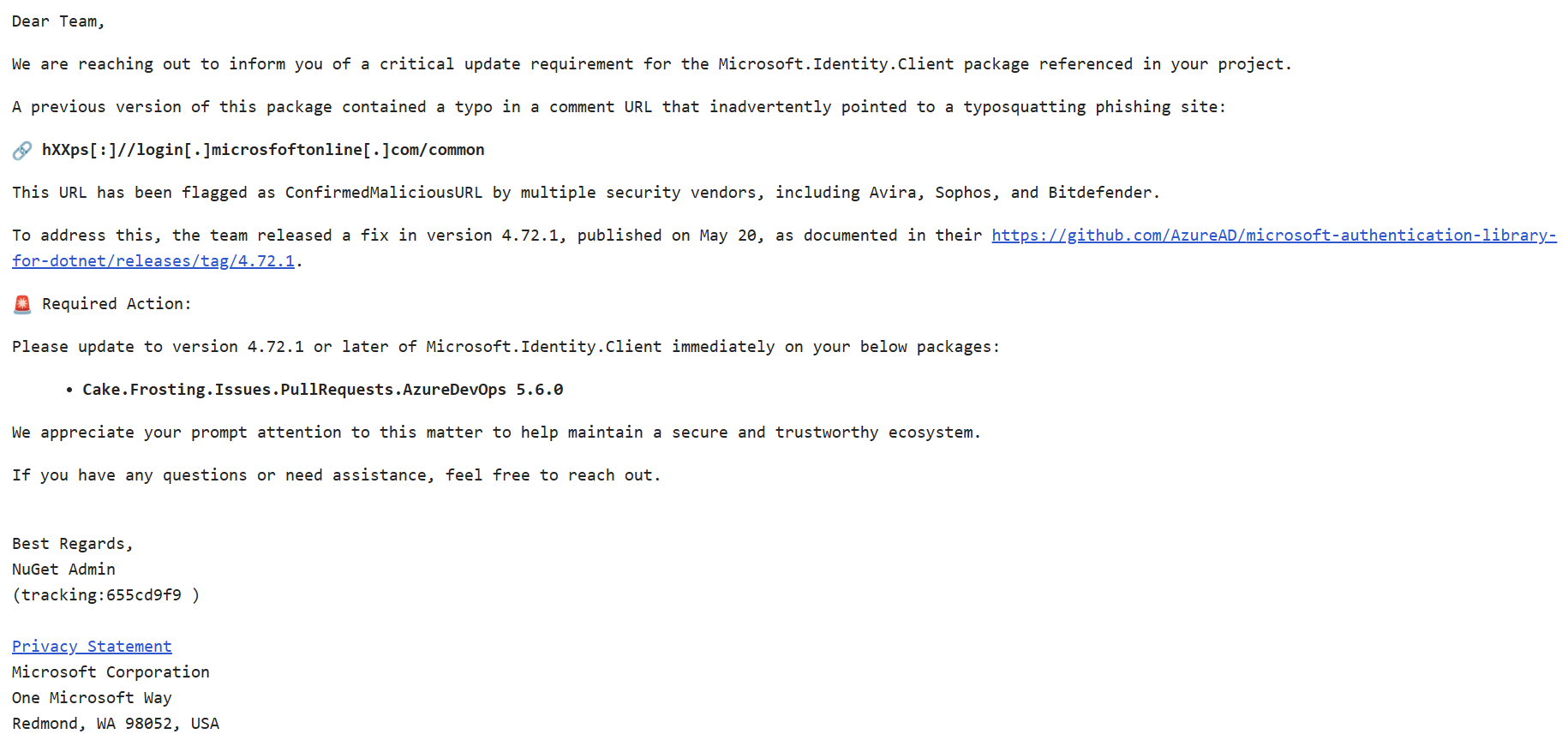 When looking at the release notes of Microsoft.Identity.Client 4.72.1 it not even mentions any CVE or related fixes. In contrast to what was written in the email it was also not fixed in Microsoft.Identity.Client 4.72.1 based on the warning on nuget.org1.